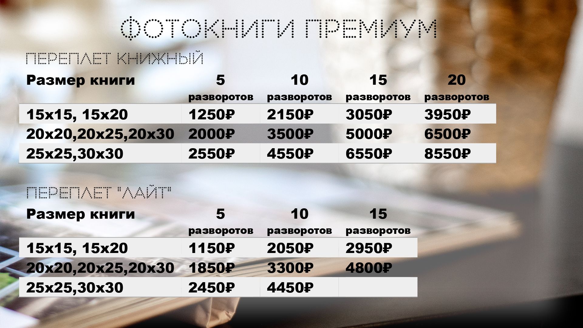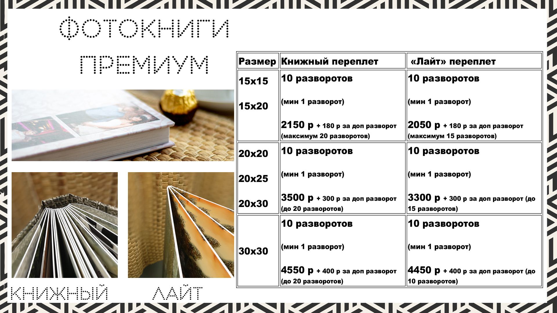 | ПРЕМИУМ | Профессиональная качественная фотопечать + переплетный материал, которым скрепляются листы. | от 15×15 см до 30×30 см | Количество разворотов от 1 до 20 | 📕Книжная фотообложка (жёсткая картонная обложка с полной запечаткой) 📘«Лайт» фотообложка (обложка по толщине как страницы) | ![]() ![]() ![]() |